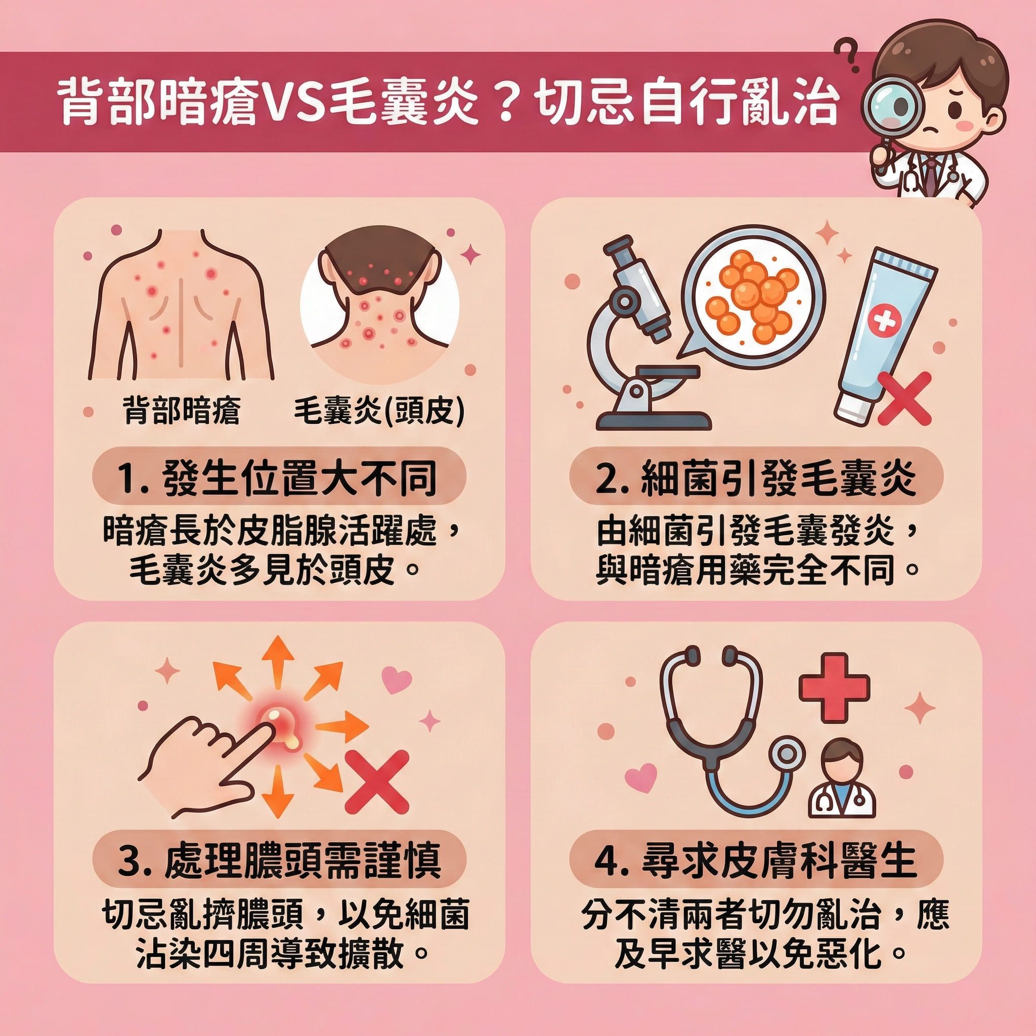 背部暗瘡位置代表肺出事?傳言背部暗瘡反映肺部不健康,肺部濕熱者才會多在背部生瘡,或背部暗瘡反覆長不停;從西醫角度來看,背部暗瘡有可能是毛囊炎引起的,暗瘡多發生於皮脂腺較活躍的地方,如面頰及背部,而毛囊炎則多發生於皮脂腺較少的地方,如頭皮、後頸等,到底背瘡暗瘡是毛囊炎還是普通暗瘡?即看此文自測!
