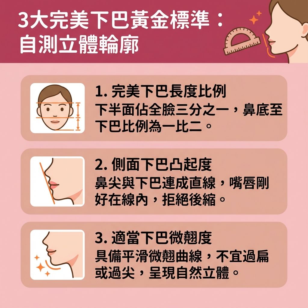 想要知道自己的下巴凸起度標不標準,可以用一根食指或筆來自測。首先,放鬆臉部。然後,用食指或筆將鼻尖和下巴連成直線。如果唇部在直線内或是處於一條線上,則符合標準。此外,也可自行比對下巴和眉心位置。如果下巴和眉心處於同一條直線上則爲標準,如果超過則是下巴凸出,如果沒有接近直線則是下巴後縮。
