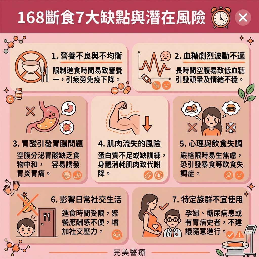 儘管168斷食對某些人有效,但其潛在的斷食缺點和的風險,對於不同身體狀況和飲食習慣的人來說,可能是相當嚴峻的考驗。