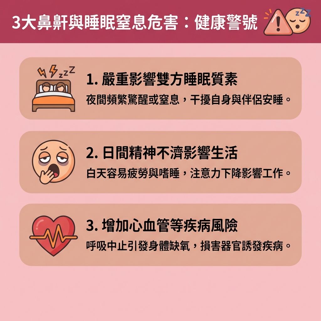 鼻鼾問題或「睡眠窒息症」可能會造成以下危害: