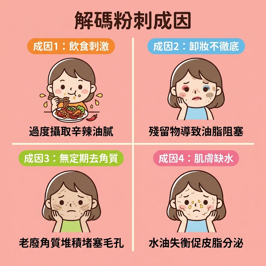 其實各種粉刺的形成原因是因為皮膚上堆積過多的老廢角質,以及油脂分泌過盛,導致毛孔出現閉塞,無法將毛孔中的廢物排出,令毛孔被撐大甚至長粉刺痘痘。 而引致毛囊堆積過多角質,或者是油脂分泌旺盛,就有以下幾種因素: 粉刺成因1. 飲食過於刺激 許多女士都是「辣妹」,所指的是「無辣不歡」,或者喜愛吃煎炸、油膩的食物,雖這些食物美味可口,但就會增加粉刺形成的機會。過於刺激、辛辣、油膩的食物都會引起皮膚的皮脂腺分泌更多的油脂,容易積藏在毛孔之中,撐大毛孔導致毛孔粗大,結果就造成白頭、黑頭粉刺或閉鎖粉刺的出現。 粉刺成因2. 卸妝不徹底 化妝對很多女士來說,是每天必做的事情,而有皮膚科醫生表示 :卸妝不夠徹底也會增加粉刺黑頭形成及長痘痘的機會。化妝品中的化學殘留物十分容易殘留在毛囊之中,形成閉鎖粉刺,如果卸妝時不夠仔細,長久下期,便會使油脂及化學品積聚在毛孔中,導致粉刺。若你疑惑粉刺跟皮脂管絲怎麼來的,很可能是護膚不當所致。 粉刺成因3.沒有定期去角質 清潔皮膚是護膚當中十分重要的一環,如果沒有深層清潔毛孔,不但會影響後續護膚品的吸收,更會導致各種粉刺的形成。人的皮膚有大約一個月的更新週期,但因為不同因素影響,新陳代謝有可能減慢,以致皮膚毛囊的更新速度也一併減慢。而去角質的步驟就可以促進皮膚的更新週期,加快老廢角質層的剝落,減少角質及死皮堆積在毛孔出口,令毛孔得以疏通,因此適當地去角質對防止白頭、黑頭粉刺及痘痘形成是十分重要,同時有效去促進痘疤代謝及痘痘浻謝。 粉刺成因4. 肌膚缺水 粉刺怎麼頻生?不要以為油性皮膚才會有粉刺黑頭問題,其實皮膚缺水一樣都會增加白頭、黑頭粉刺出現的機會。除了控油以減少油脂分泌(皮脂管絲太多也可能是出油多的徵兆)水油平衡對維持皮膚的健康十分重要,如果皮膚缺少足夠的水分,就會促使皮脂腺分泌更多的油脂去滋潤皮膚,隨時令皮膚變得越油,堵塞毛孔,所以不少女士即使是乾性皮膚,但經常出面油就是這個原因。