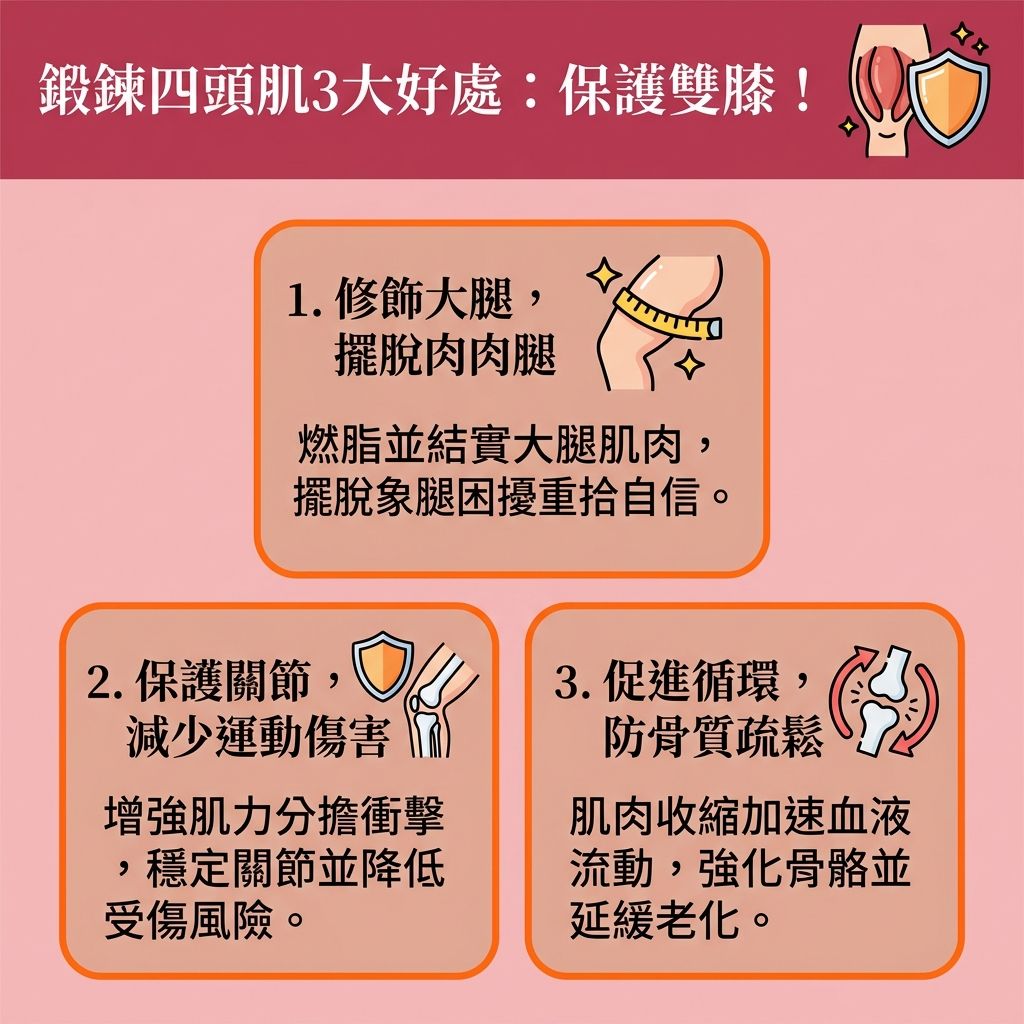 因此通過鍛鍊股四頭肌,不僅能提升肌肉力量使膝關節穩定,同時亦會分擔與吸收運動時所產生的一部分衝擊壓力,從而減少膝蓋關節損傷的風險。