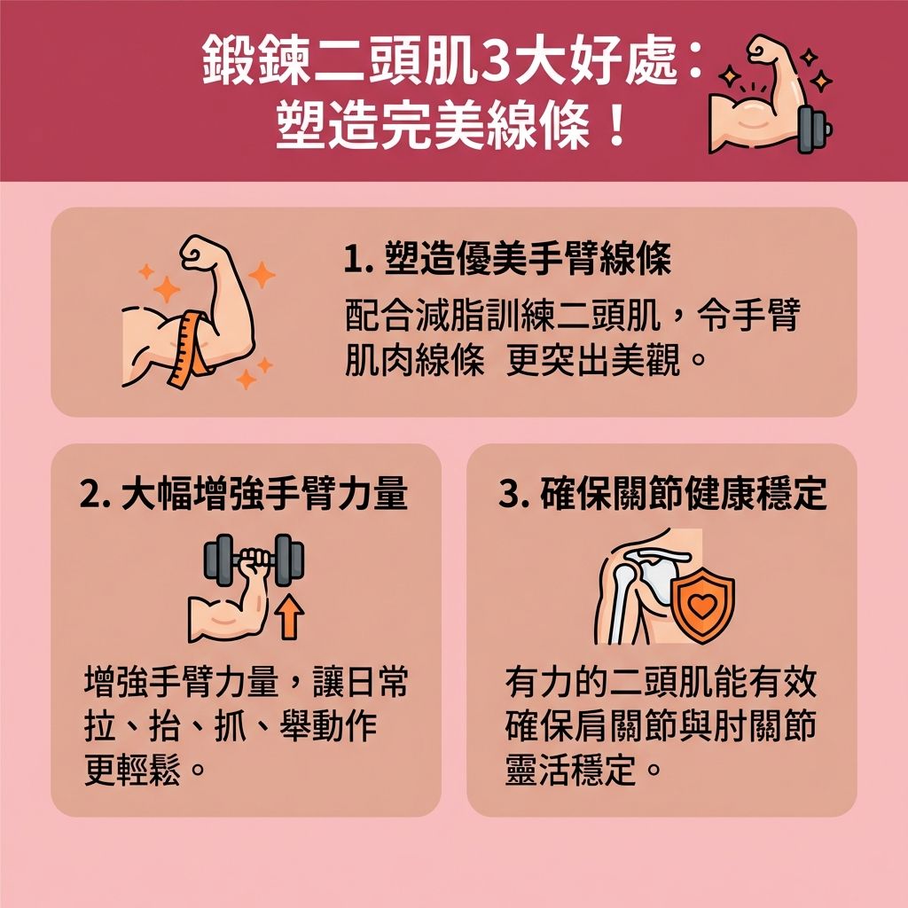 1. 訓練二頭肌可以令手臂線條更美觀。現今人們都在強調健美感,不再是骨感纖細才是美,反而手臂有肌肉線條更好看,而二頭肌屬於最突出的肌肉之一,能夠最直接地反映出線條。要注意,肌肉訓練也要配合減脂,否則脂肪會把肌肉蓋過! 2. 訓練二頭肌可以令手臂肌肉更有力量,任何拉、抬、抓、舉有關動作,都有二頭肌參與在內,好好鍛煉你的二頭肌可以增強這些動作的表現,做很多事都會覺得更輕鬆。 3. 訓練二頭肌可以確保關節健康。二頭肌上承肩關節,下接肘關節,更有力的二頭肌連接有效確保穩定性和靈活度。