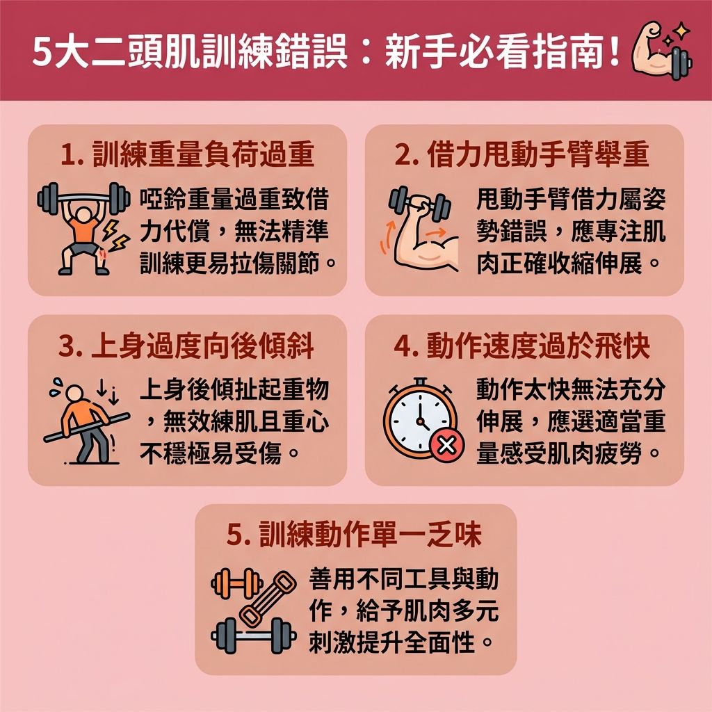 二頭肌訓練動作看似簡單,但正因如此,不論是健身新手還是有經驗人士,都會忽略一些常見錯誤,可能會降低訓練成效,更甚有可能會導致肌肉及筋膜受傷,以下是5個常見誤區。
