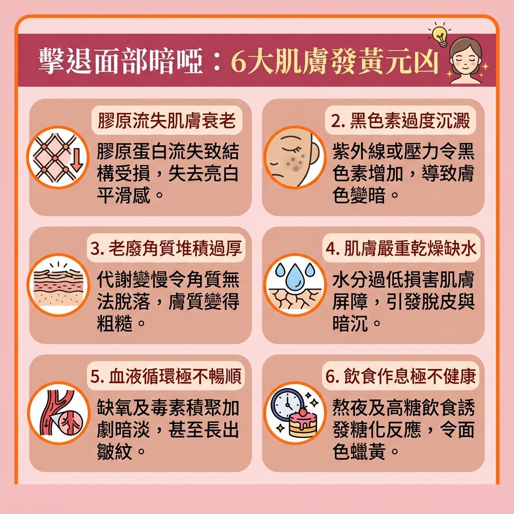 隨著年齡的增長,很多人都會發現自己的皮膚狀況每況愈下,各種初老症狀漸漸浮現在臉上。其中,皮膚初老最常見且明顯的特徵之一便是膚色暗啞。千萬別小看膚色黯啞這一問題,它不僅會導致我們的外表看起來非常憔悴,如果情況繼續惡化,甚至可能會導致色斑的出現,令人看上去異常蒼老。本文章細説了膚色暗啞的原因、改善膚色暗啞的食物以及改善問題的其它方法,以全力幫助大家臉部容光再現。