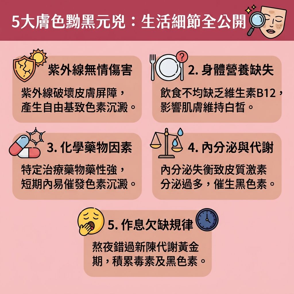 皮膚變黑是眾多愛美人士的容貌焦慮,變黑很容易,但要想回到白皙膚色卻像登天一樣難!一起來了解導致皮膚變黑的5大因素與全方位美白攻略,文末也附上了大家心心念念的淡斑神器喔!