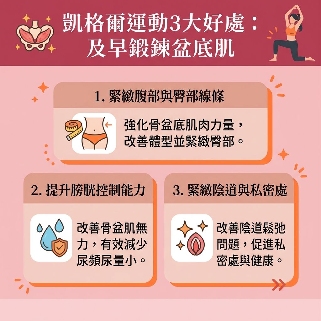 凱格爾運動是一項由婦產科所研究出來的運動,他提出通過主動收縮盆底肌群提升盆底肌力,達到恢復陰道緊緻,並改善肌肉彼此的協調性,從而達至改善性功能、提升膀胱的控制能力,減少尿頻、失禁的情況發生。
