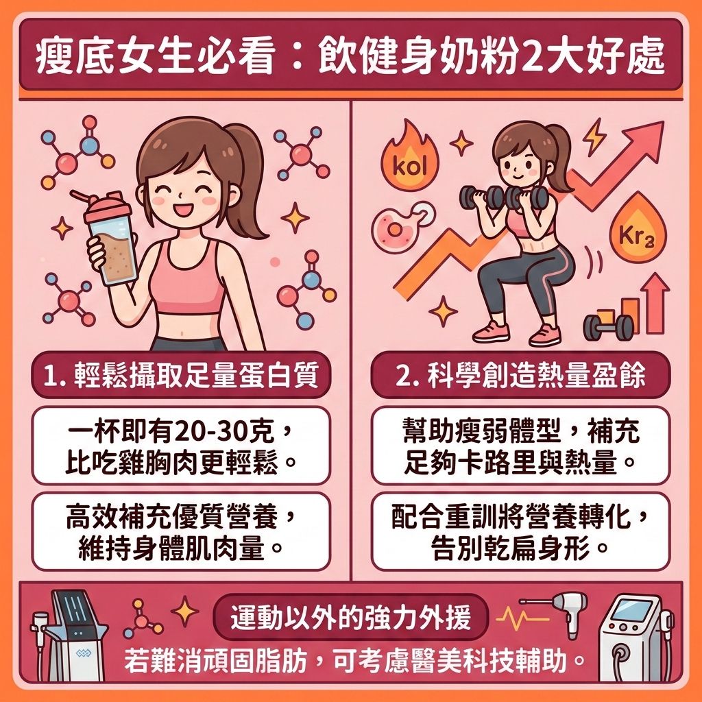 對於「吃不胖」的瘦底女生,增肌奶粉能幫助創造熱量盈餘。若配合重訓,這些額外的熱量與蛋白質能轉化為肌肉,改善乾扁身形。