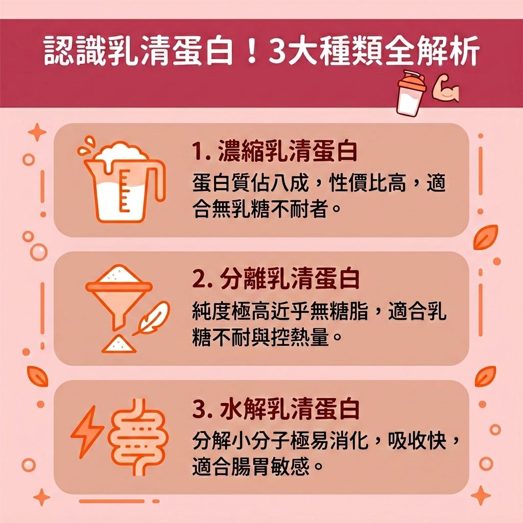乳清蛋白含有豐富支鏈氨基酸(BCAAs),是肌肉生長的關鍵。市面產品主要分為三類,價格與純度各異: