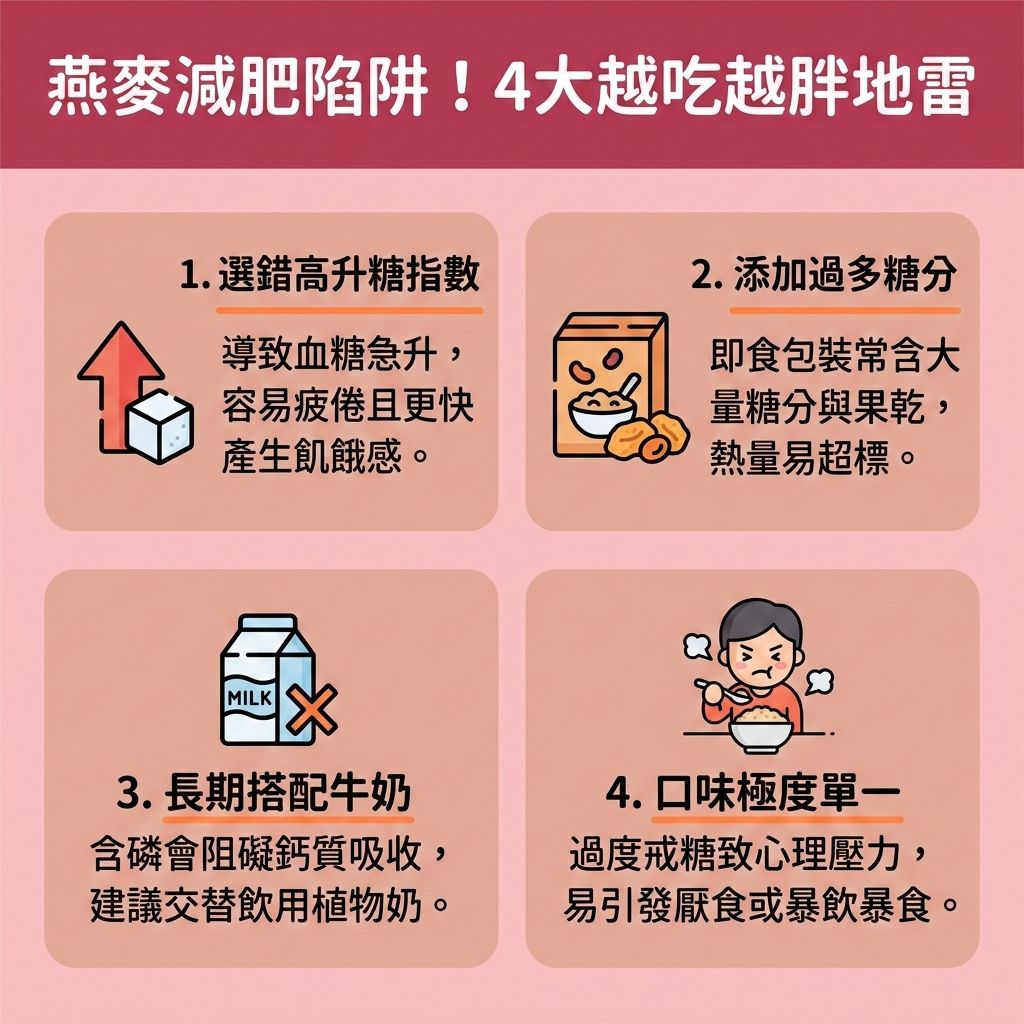 雖然燕麥被譽為減重聖品,但若不了解其營養特性與正確食用方式,這項健康食品也可能變成致肥元兇。以下整理了現代人最容易掉入的燕麥減肥陷阱,幫助你重新檢視自己的減肥餐,確保在享受燕麥的好處時,不會因為錯誤細節而讓減脂計畫功虧一簣。