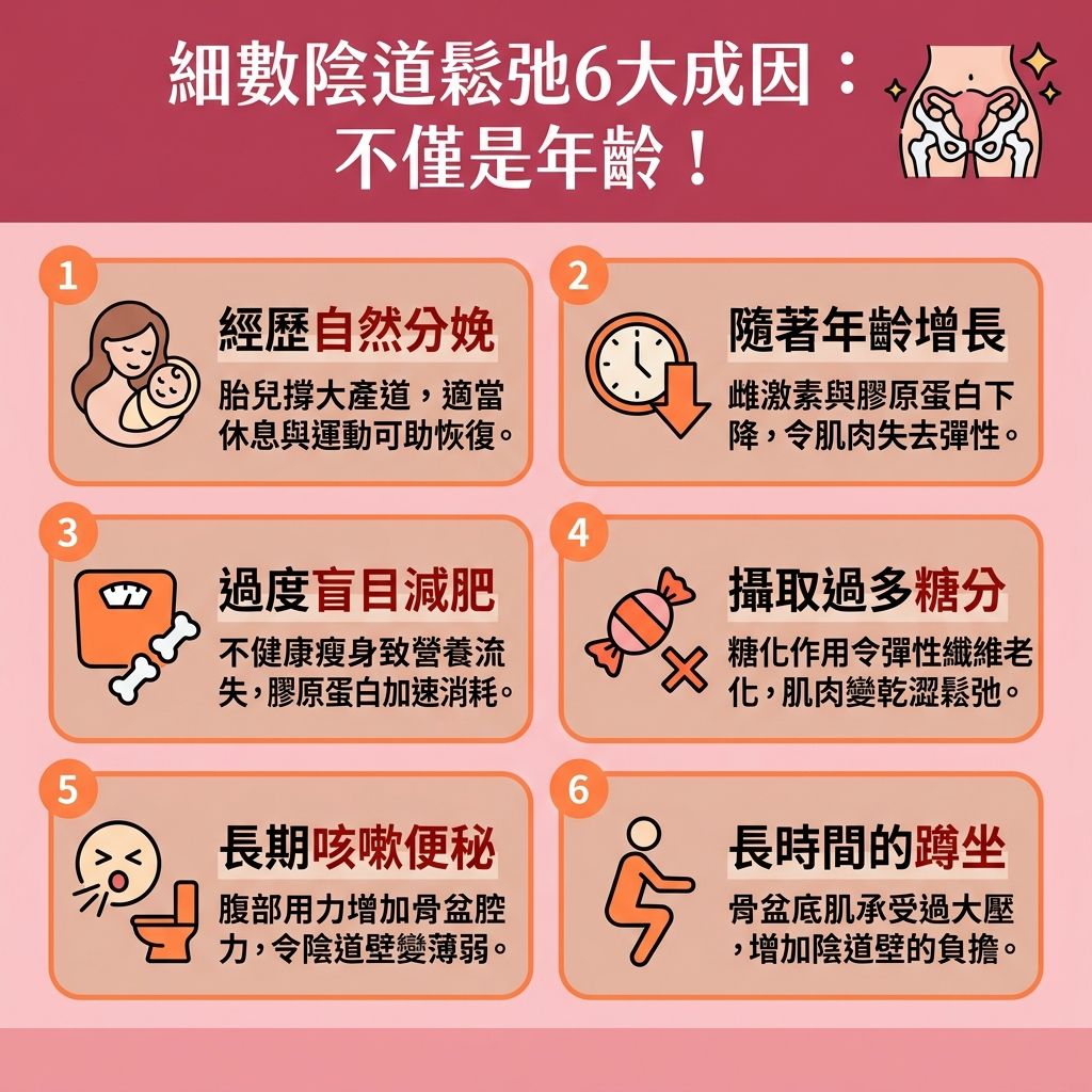 千萬別看輕咳嗽和便秘的問題,一樣會令陰道變得鬆弛!由於咳嗽和排便時都會用上腹部肌肉的力量,因此長期咳嗽以及便秘的話,會增加骨盆腔壓力。陰道壁的肌肉力量較為薄弱,無法長期承受骨盆腔壓力,久而久之就會增加陰道壁變得鬆弛的機會。